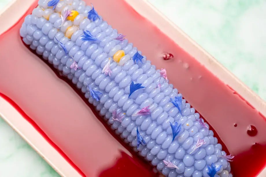 Η ιστορία, σύμφωνα με το Eater, ξεκινάει το 2020 όταν το εστιατόριο Chifa LA, φτιάχνει ένα vegan jelly με γεύση αμυγδάλου σε μορφή καλαμποκιού. Το «καλαμπόκι» βγήκε σε αρκετές παραλλαγές, η πιο επιτυχημένη είναι αυτή η παστέλ με τη σάλτσα κόκκινων φρούτων. Λογικό. Στην εμμονή με το καλαμπόκι βοήθησε και αυτό το βίντεο (που άλλου, στο Τik Tok).